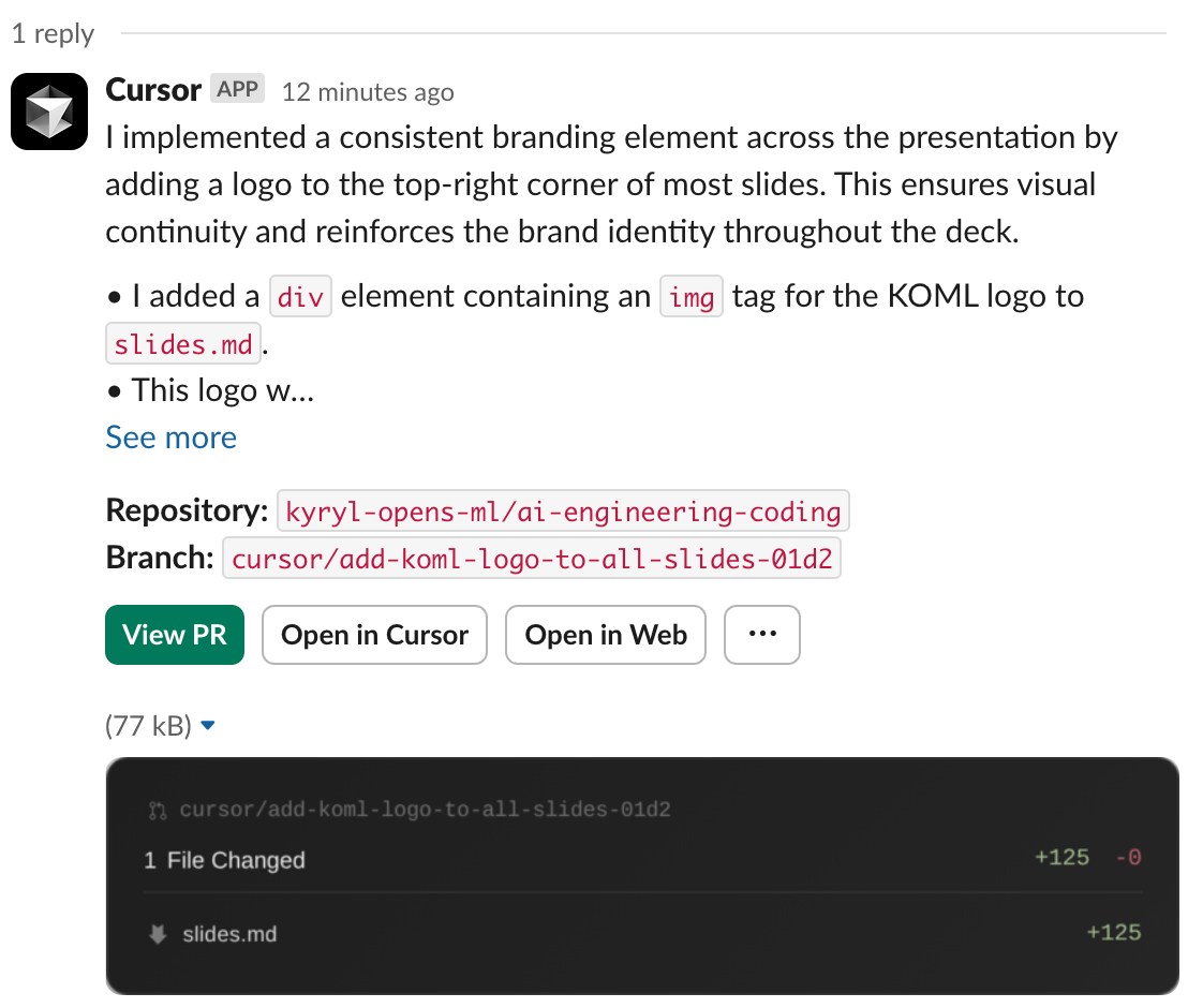@Cursor repo=kyryl-opens-ml/ai-engineering-coding "Add KOML logo to all slides in slides.md please: https://avatars.githubusercontent.com/u/154631148?s=400&u=7655f835707397b8e92ad05044b5c3c9f7678348&v=4"